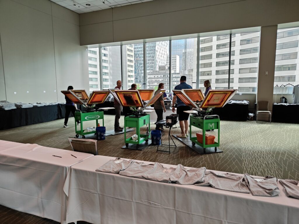 参加者がデザインを選択したら、 その場で選んだデザインをTシャツにプリントしていました。下記の写真が、Tシャツにプリントしているところです。